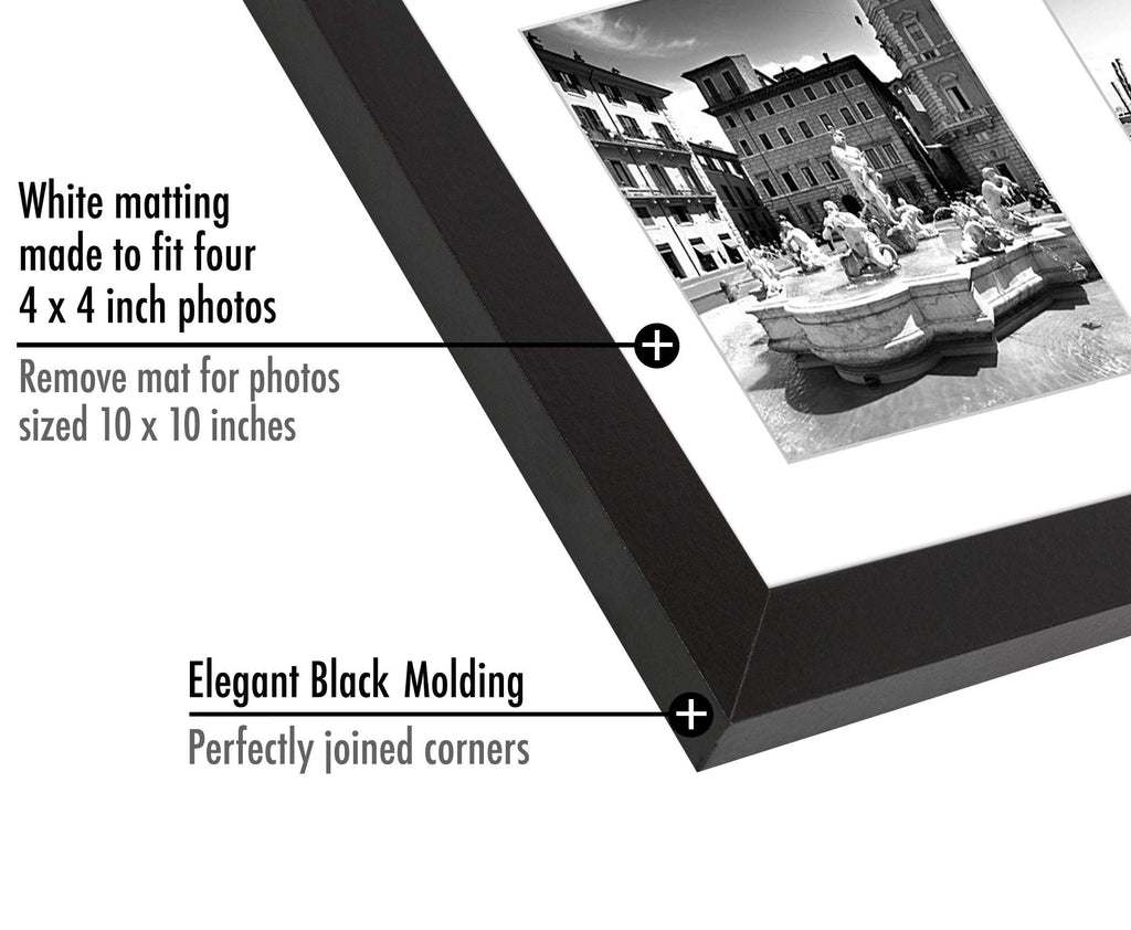 - Design: Black 10x10 inch collage picture frame with four 4x4 inch openings; photo frame includes a white beveled mat and hanging hardware for hassle-free display to hang flat against the wall.