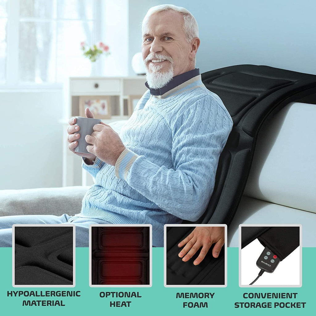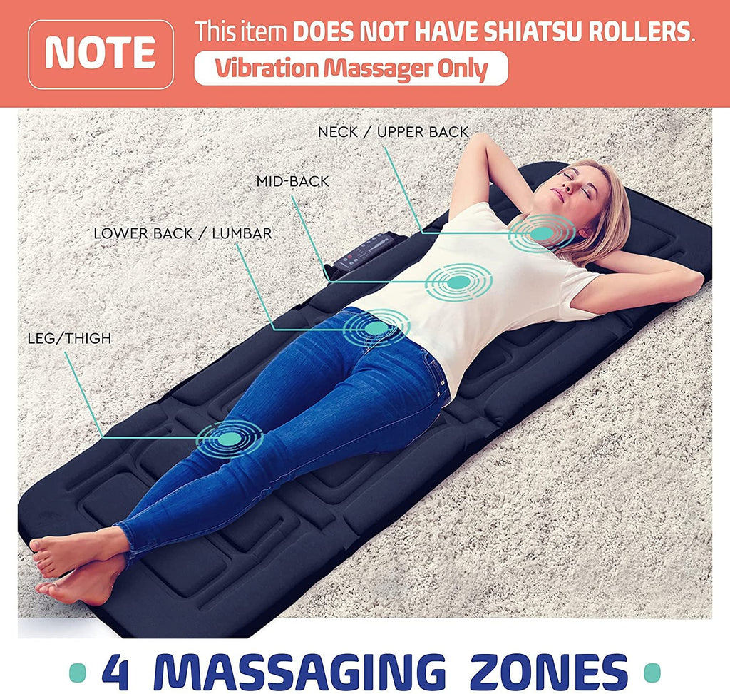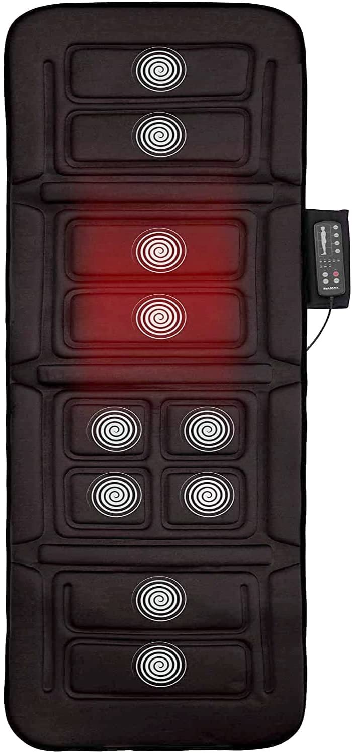 A good massage - sitting up, laying down or laying back.Think you need to book an appointment or wait in line at the salon for an invigoratingmassage experience? We beg to differ. With this invitingly soft plush massage mat fromBelmint, you can hit every spot as well as a pro does - without spending a fortune insalon fees. From your neck to your shoulders, from your back to your lumbar area, fromyour glutes to your thighs and more, enjoy a personal massage at the touch of a button.Best of all, this mat's 10 motors never tire, so you can literally rest in pleasure all day long.Features? 10 Invigorating Massage Motors Deliver Full-Body Relief from Tight & Sore Muscles? 5 Preprogrammed Modes; 4 Independently Controllable Zones; 3 Intensity Levels? Flexible Plush Mat & Intuitive Handheld Controller - Perfect for Sitting/Lying Down? Switchable Warmth Function Soothes Lumbar Area; Warmths to 90°F in just 7.7 Minutes? Side Pouch Accommodates Handheld Controller; Minimizes Unwanted Changes Specs & Details Measures: 5.5 feet long 1.9 feet wide Weighs: 5 pounds Vibration: 3 selectable vibration-intensity levels Warmth: upto 90°F in just 7.7 MinutesHow to Enjoy1 Store at home use with nearly any chair or couch 2 Remove any ties, and neck jewelry before use3 Warmth function is switchable right from the corded handheld controller4 3 selectable vibration-intensity levels let you dial in the joy5 Relax and enjoy relief from pain and stress!6 Easy to clean while remaining comfortable to use7 Fold easily for transport and storageWhat's in the Box??10-Motor Massage Mat? AC power adapter? User ManualRisk free | Backed by a 100% SATISFACTION GUARANTEE! Your body deserve the relief, and you deserve the comfort. Get yours today and start feeling better immediately.
