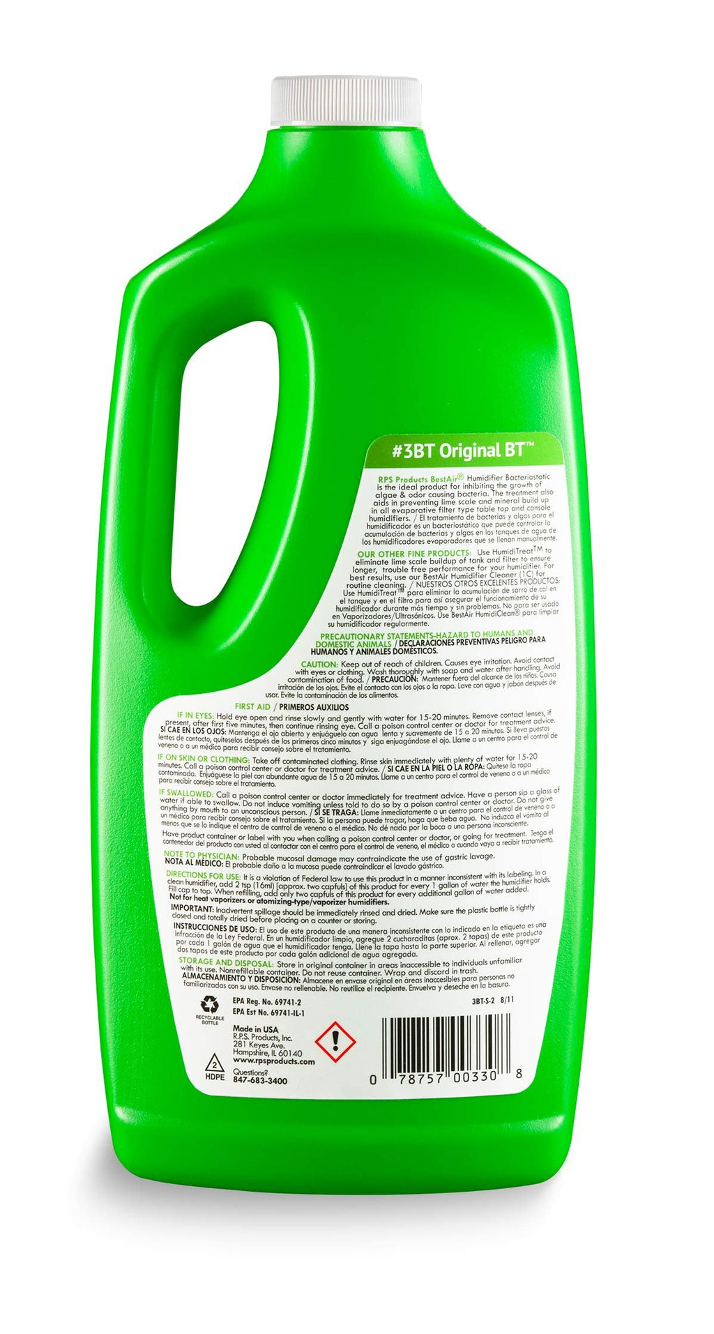The BEST-AIR-3BT is a bacteriostatic water treatment product that helps to inhibit the growth of bacteria, mildew, and mold from growing on your humidifier filter. Used with evaporating humidifiers, not vaporizers, this product will reduce the bacterial growth on your filter and allow your machine to produce fresher smelling air. Without treatment humidifiers can become a breeding ground of mildew, algae, and mold growth with contributes to unusual odor and potentially harmful contaminant distribution. Protecting your filters also affords increased efficiency and filter life. Order your BestAir Humidifier Bacteriostatic Water Treatment today!