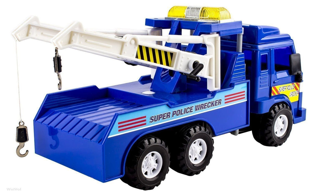 Big-Daddy Let's Pretend Wrecker Tow Truck is the perfect toy truck to help you kid drive his imagination in to his own reality. Tow the truck with two adjustable strings to pull a car. Friction powered so it will run when you roll it. Police style with fake lights on top. Recommended Gift for ages 3 years old and up. Friction powered, no batteries needed. Hours of Fun and Imagination The Big-Daddy Tow Truck you remember is now ready for duty for the next generation with hours of fun playtime and imagination. Rugged steel construction and realistic design keep each vehicle ready for action any place where young adventurers gather. Each vehicle features deep-cleated tires and working features for years of realistic play. This classic tow truck lifts and tows.