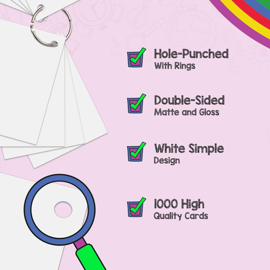 - PACKAGE INCLUDES: (1000) white blank cards (2”x3”) and (5) metal sorting rings.