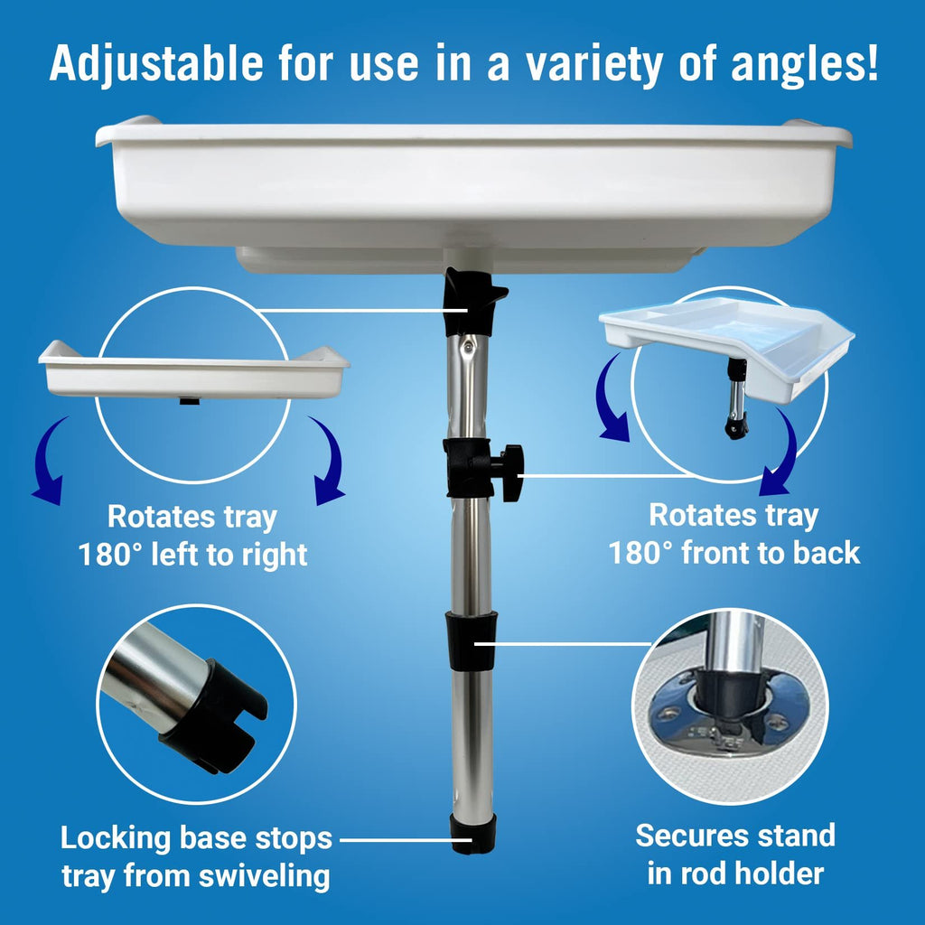 - ADJUSTABLE FOR VARIOUS ANGLES: Our fillet table for boat has a dual adjusting arm to work with straight and angled rod holders. You can tilt it left to right and back and forth. Easily remove it for cleaning and storage unlike other bait trays.